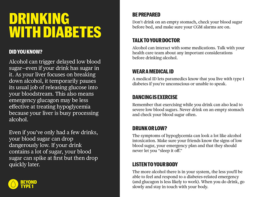 “If you’re drinking, particularly in the evening, make sure that you’re eating something as well,” Constance says. “Also be sure you’re careful to monitor your blood glucose after you’ve been drinking because just like you can have that low as a result of physical activity, you can also have a low as a result of alcohol.”